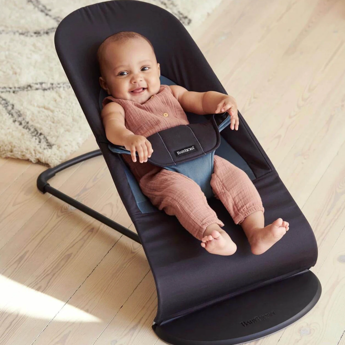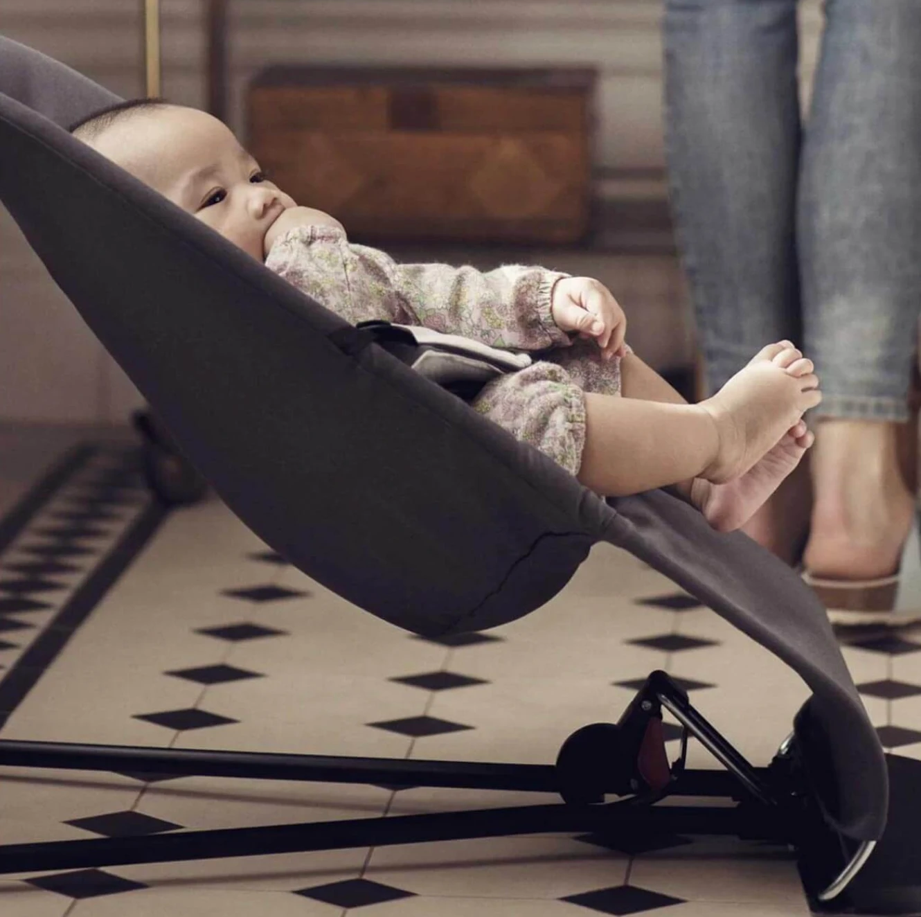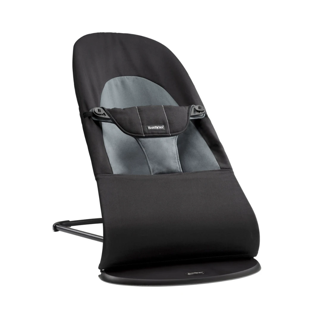 The BabyBjorn Bouncer in Black/Dark Grey with a Black Frame is a baby bouncer designed to provide comfort and support to infants while allowing them to bounce and play.