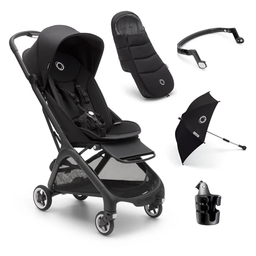 The Bugaboo Butterfly Compact Stroller with matching accessories in Midnight Black lets you unlock the city one adventure at a time. It’s made for your high-paced city life with a one second fold and an ultra compact design. You and your growing baby can now explore the streets in style. The elegant design and streamlined shapes of the Bugaboo Butterfly were inspired by decades of stroller innovation. With its award-winning Bugaboo design and rigorously tested engineering, the Butterfly is built to last.