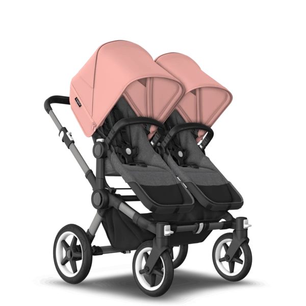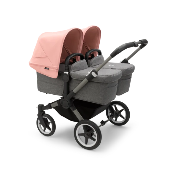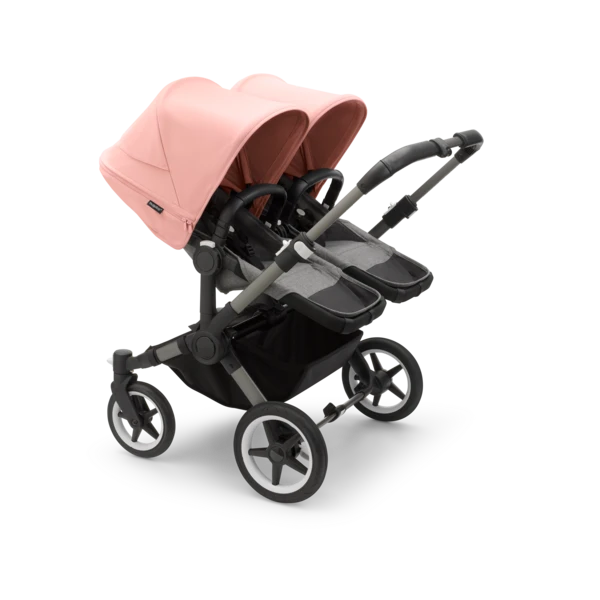 The NEW Bugaboo Donkey 5 Twin Pushchair & Carrycots in Morning Pink on a Graphite chassis with Grey Melange Style Pack is designed for discovery! This double side-by-side stroller is smaller than you think and keeps siblings closer than ever, which promotes bonding and shared experiences.