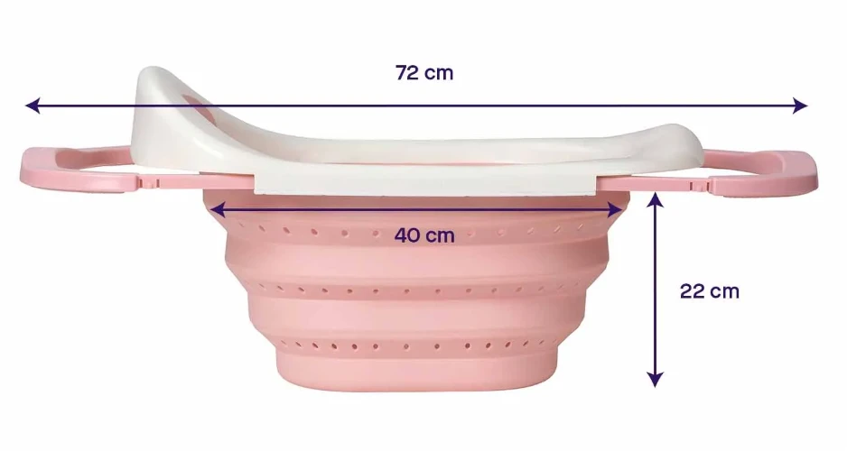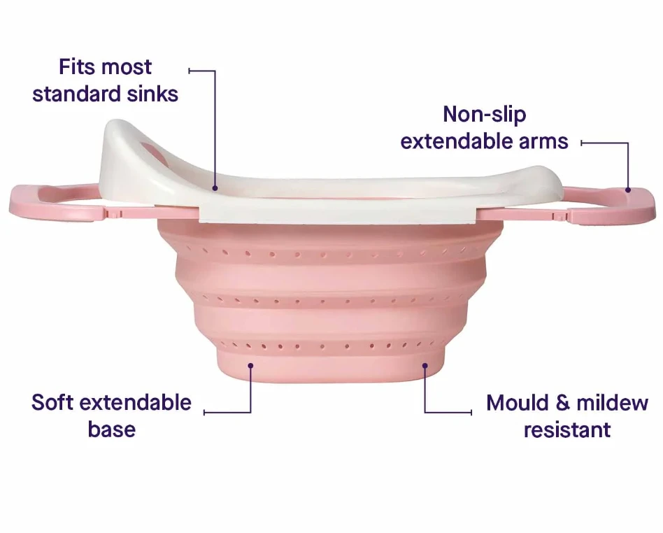 Designed to sit over any standard sink it gives the ideal height for you for bathing your baby and with a soft, flexible and perforated basin, it means no heavy lifting or draining tubs filled with water, no bending over the main bath, no bad posture and no water mess or spills, just easy and gentle bathing for your new baby.