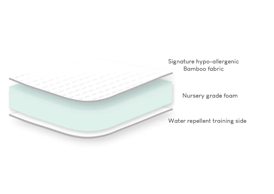 One side features an easy-clean waterproof training layer, a must-have for those first potty training days. The other side showcases Lullaby’s signature bamboo fabric with naturally hypoallergenic and anti-microbial properties. These properties help to maintain a germ-free, clean sleep environment for your little one.