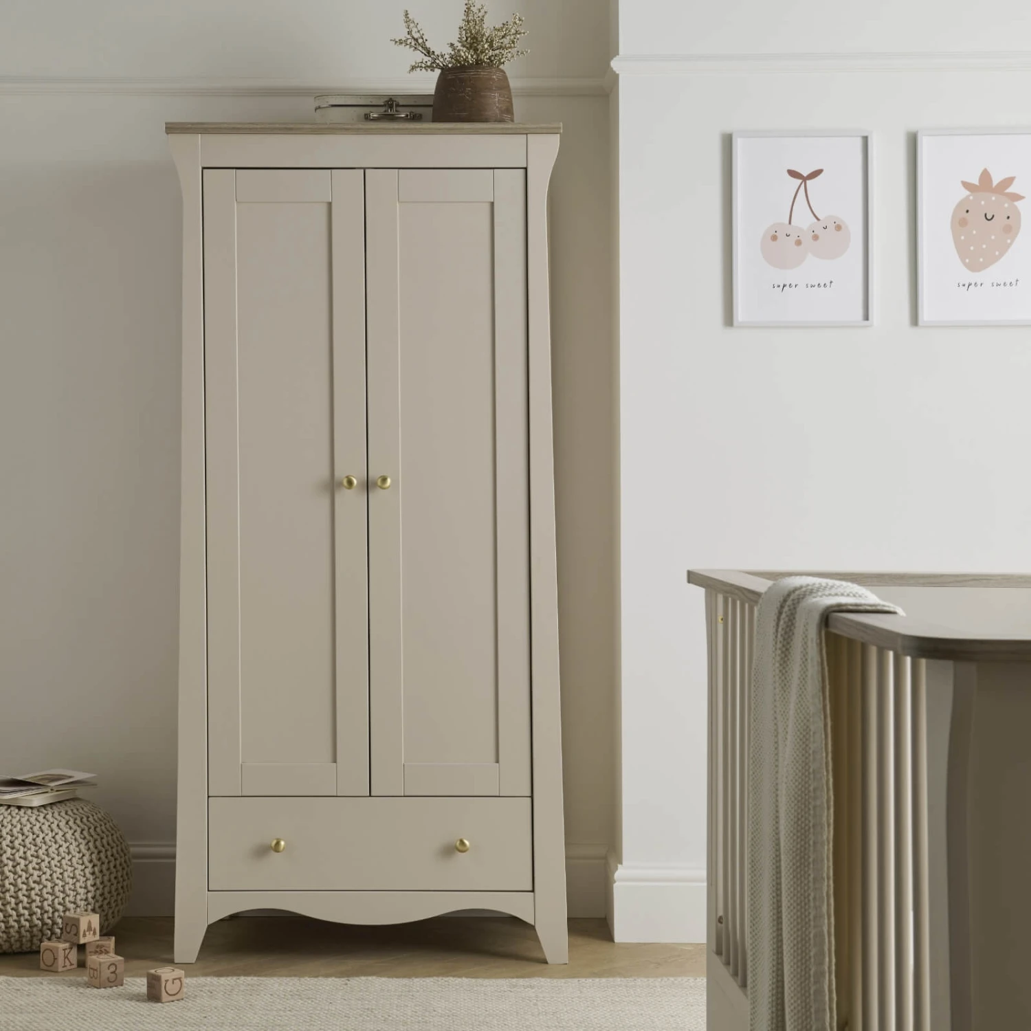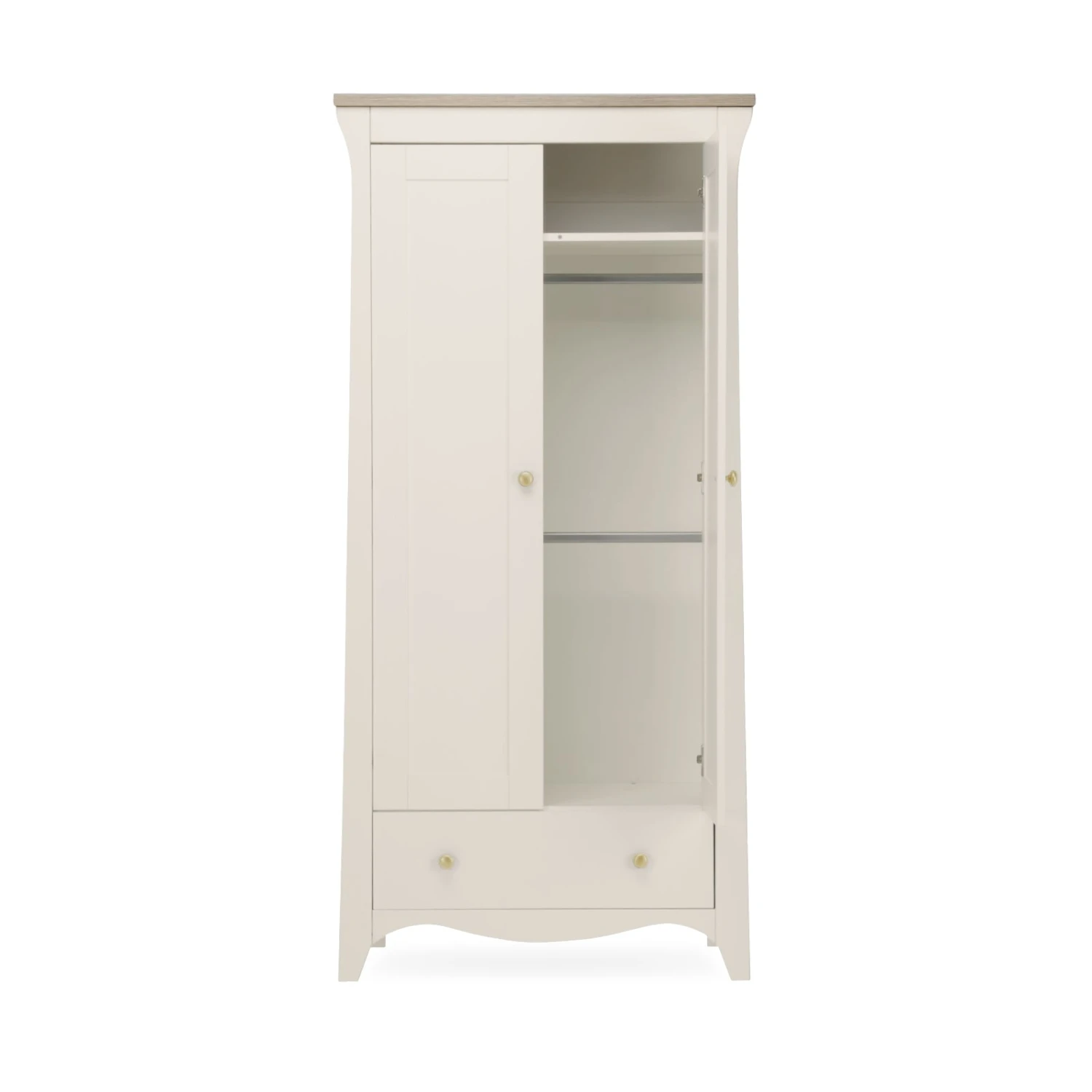 The Clara Nursery Wardrobe has ample room to keep your baby’s clothes organised. This double wardrobe has 2 removable hanging rails for keeping their tiny outfits neat and tidy. Inside the wardrobe is a deep shelf, perfect for storing baby bedding or blankets. Plus, the Clara Wardrobe also has a roomy drawer providing extra storage.