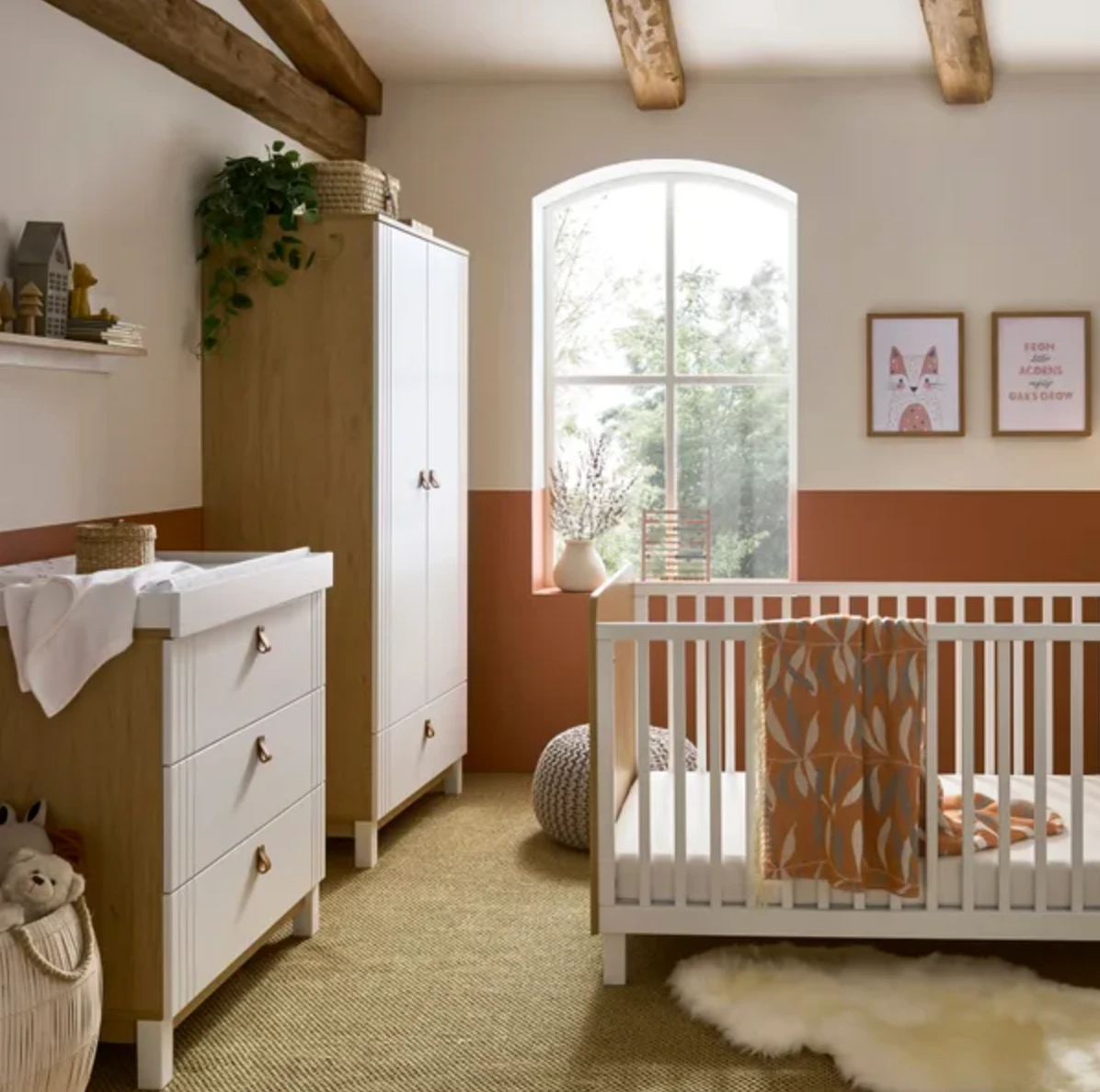 The CuddleCo Rafi 3 Piece Nursery Furniture Set in Oak White ticks all the requirements for the modern nursery. Rafi adopts a bold, minimalist design, featuring a contrasting colourway of natural oak tones paired with a crisp, white painted finish. Delicate linear detailing and soft leather handles provide the perfect finishing touches.