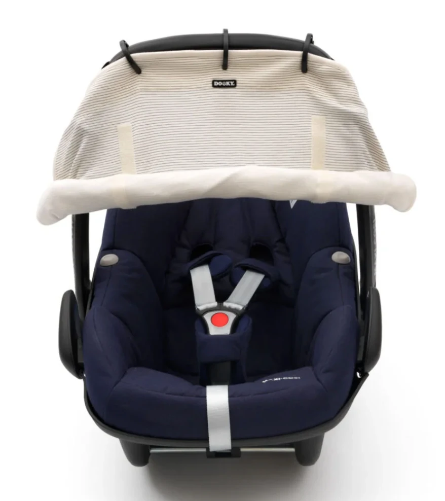 The Dooky Sunshade in Linea is universal and easily fits, in seconds, to any infant carrier, stroller or pushchair. Because of its unique design, Dooky is easily adjustable – simply roll up or down using the Velcro strips, keeping the sunlight away from your little one’s face. When baby is asleep, simply roll all the way down to create a dark and quiet atmosphere.