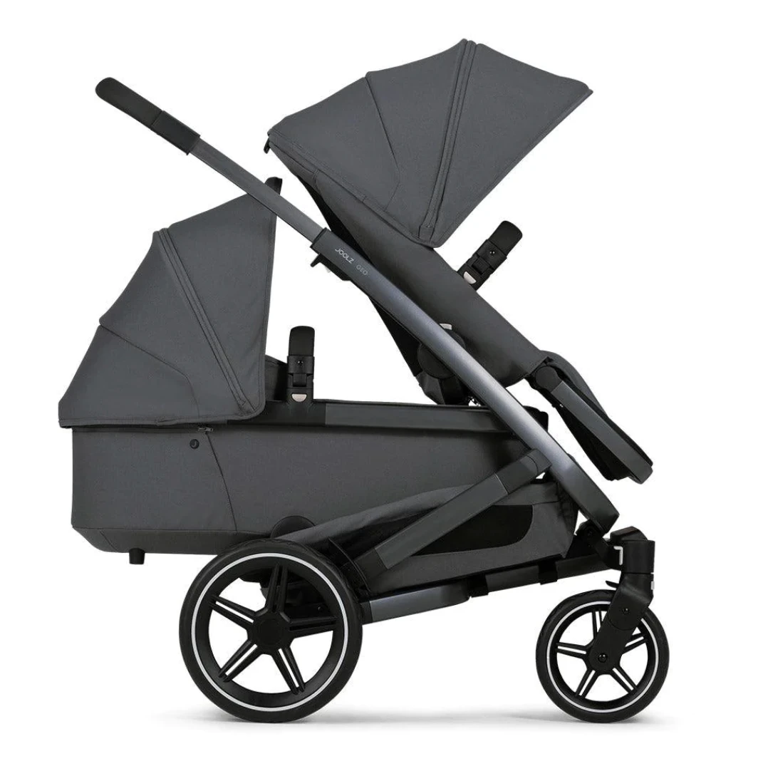 Additionally, the large front wheels and 4-wheel suspension provide a smooth ride, while the reflective strips ensure maximum visibility on nighttime strolls. Whether you’re taking a stroll through the park or running errands around town, the Joolz Geo3 is perfect for any journey. The Duo is perfect for families with one or two little ones, this versatile pushchair is easy to adapt to your changing needs. Simply attach the lower adapters to accommodate a carrycot in the lower position of the stroller, click on the extra bumper bar and sun hood and you’re good to go as a Duo stroller. (Upper adapters are available separately HERE if you want to put the cot on the upper position of the stroller.)