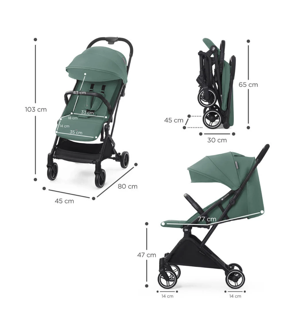 The Kinderkraft Indy 2 in Sea Green is an ultra-lightweight, easily manoeuvrable and compact folding stroller designed for the city adventures. Suitable from birth up to 15 kg of child’s weight, the aluminium chassis is equipped with four easy running wheels made of puncture resistant EVA foam. Each wheel comes with a built-in shock absorber that allows for a comfortable ride and easy going on curbs. A parking brake on rear axle is comfortable to set and release. The Indy 2 features a one hand folding system with automatic locking mechanism that protects the stroller against accidental folding and unfolding.
