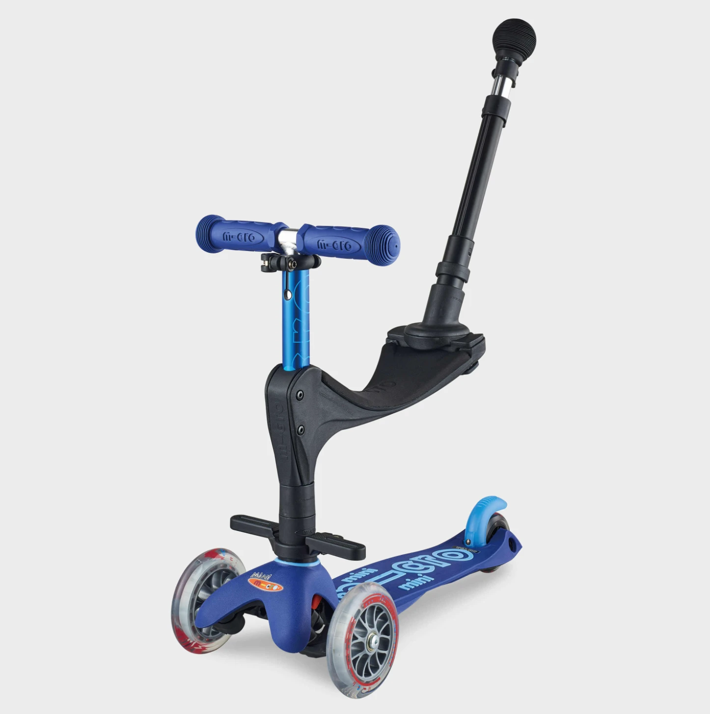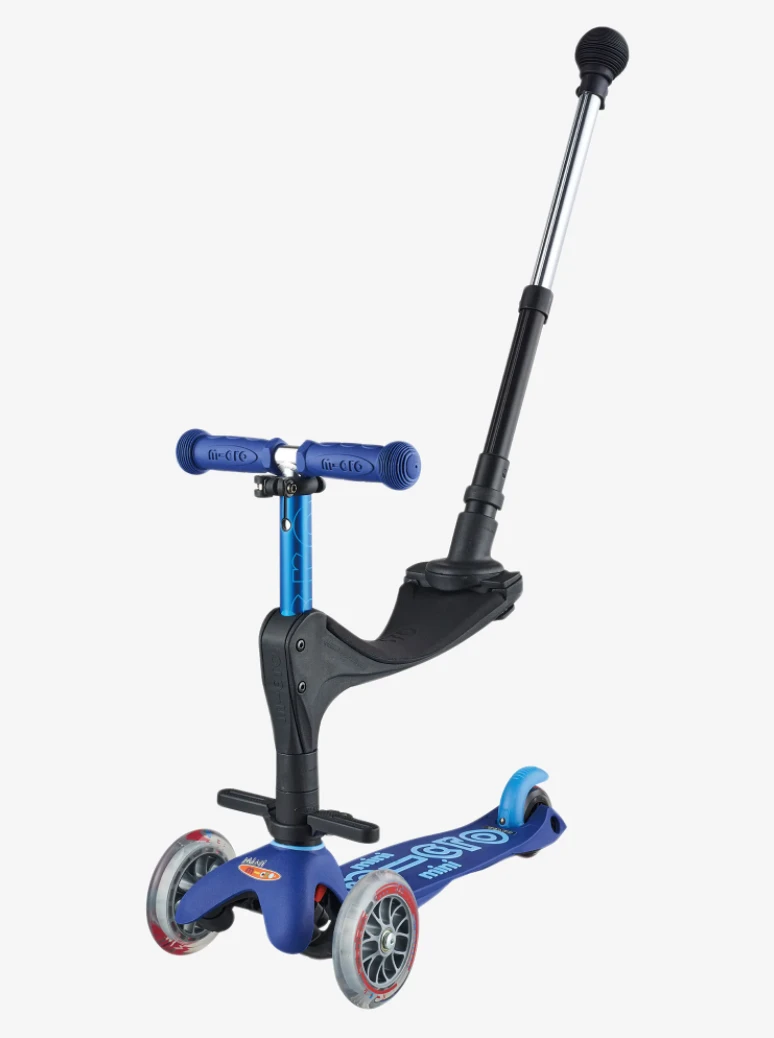 The Micro Scooter Mini Micro 3in1 Push Along in Blue is a scooter with a trio of talents. Its a ride-on scooter with adjustable seat and removable parent steering handle from 12 months, then a lean-to-steer toddler scooter with ultra-manoeuvrable O-bar from 18 months.