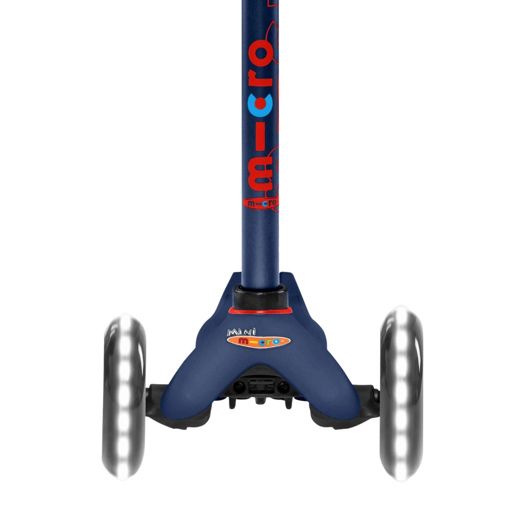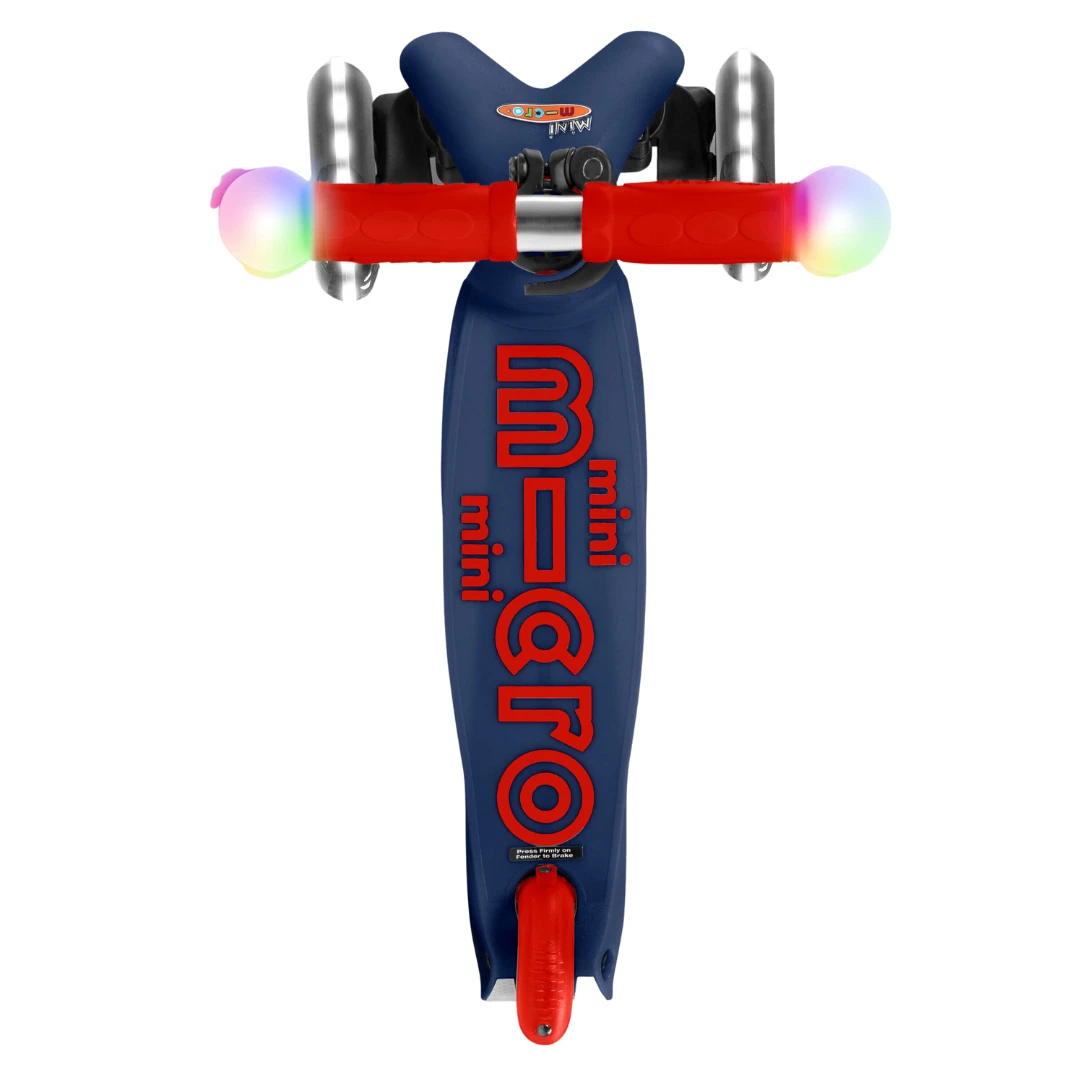 The Micro Scooter Mini Micro Deluxe LED Magic in Navy is their brightest scooter yet! The unique handlebars light up the minute kids touch them – alternating through five bold colours as they ride. Micro Scooter’s ingenious LED wheels use induction energy to turn the power kids create as they scoot into bright white light. Big on fun, big on safety too – with ultimate visibility for scooting in dark conditions.