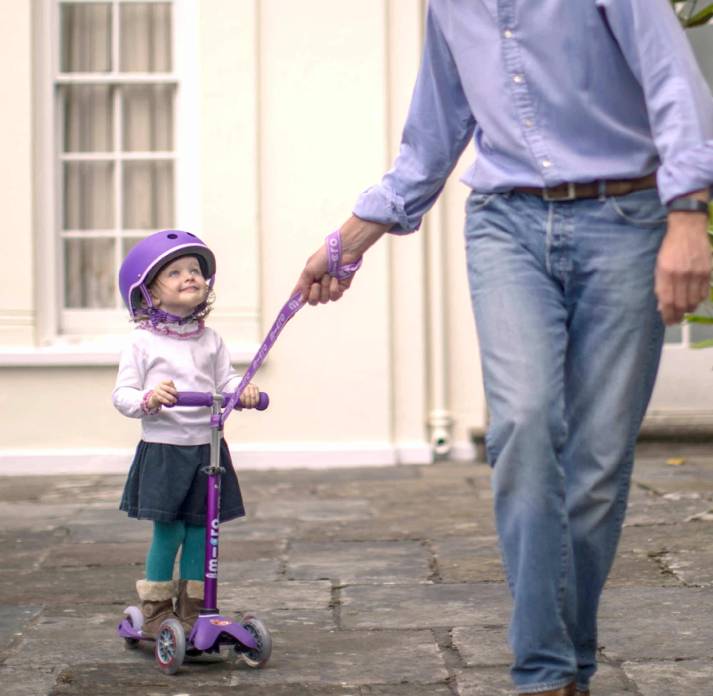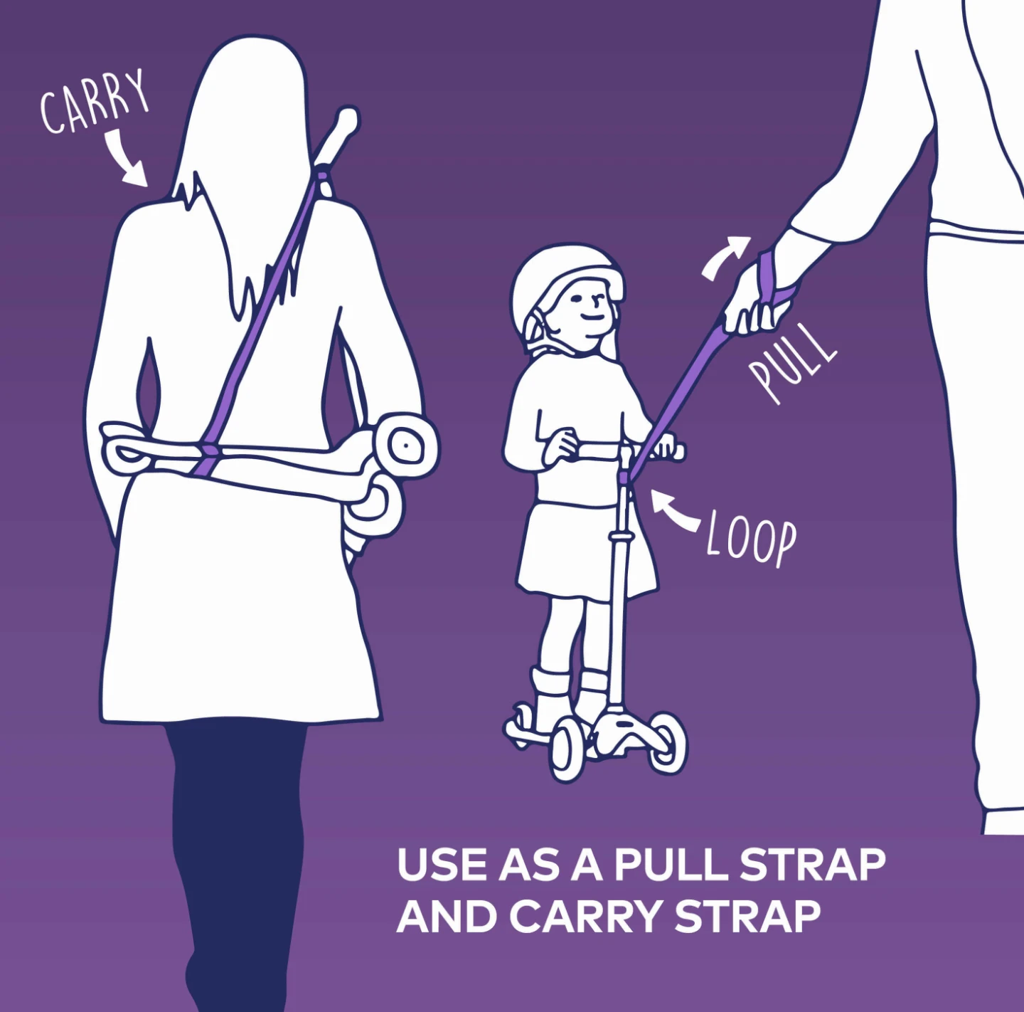Scooting can be tiring work for little legs. Fear not – with the Micro Scooter Pull & Carry Strap in Purple getting tired toddlers home is a real breeze. You can simply loop the strap around the handlebars of the scooter and pull them along.