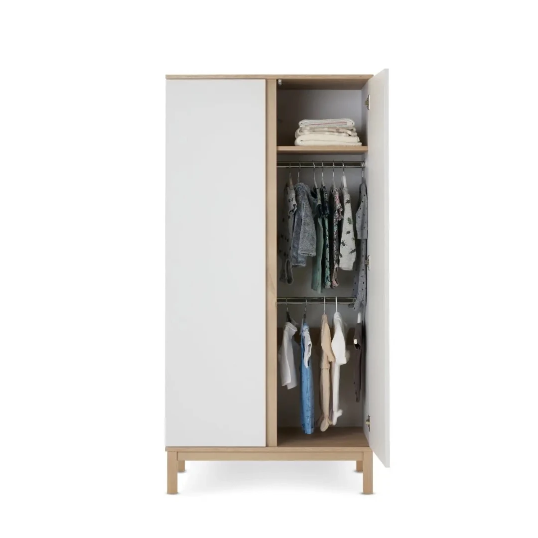 The Obaby Astrid double wardrobe in White is part of a new modern collection and is the perfect addition to any new nursery. The Sleek modern craftsmanship with two-tone colourway, no-handle doors and the large cupboard space featuring two hanging rails and a single full width shelf make it the perfect blend of practical storage space and contemporary design.