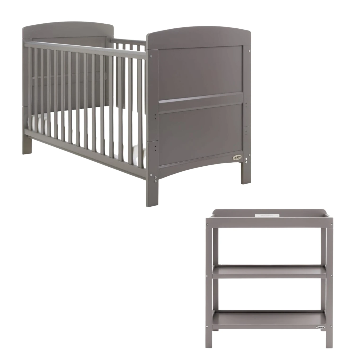 The Obaby Grace 2 piece furniture set in Taupe Grey, consisting of a Grace cot bed and open changing unit balances fantastic quality with great value and provides parents with a range of valuable features.