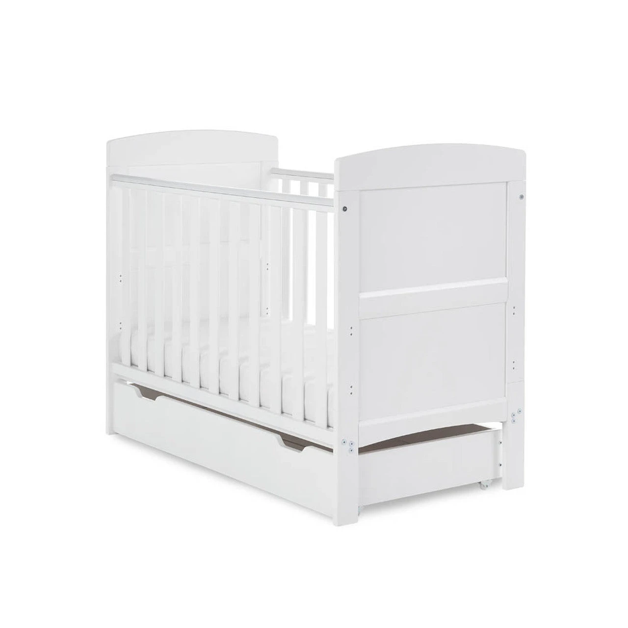 Balancing simplicity and style with a selection of valuable features, the Obaby Grace mini cot in White with a Eco-Plus Mattress is perfect for those who love the simplicity and elegance of the classic Grace but have limited space.