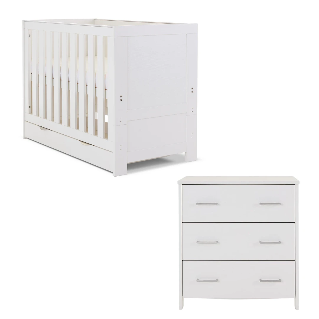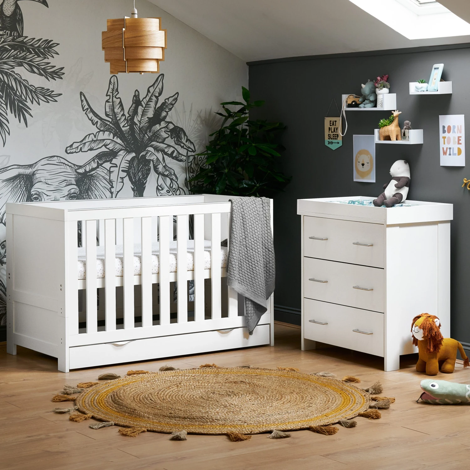 The Obaby Nika range offers a contemporary design, due to its clean lines and textured oak effect finish, that will fit perfectly in today’s modern nursery. This 2 piece room set consists of Nika cot bed and changing unit.