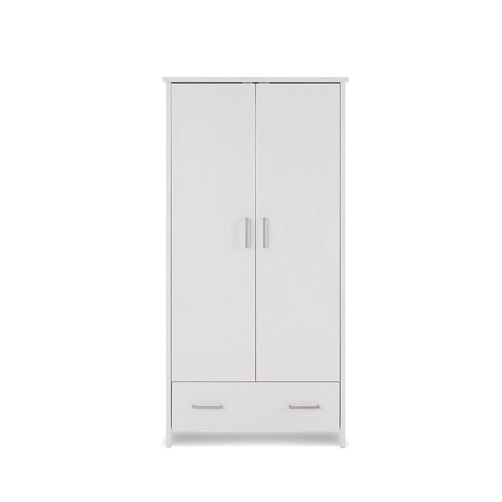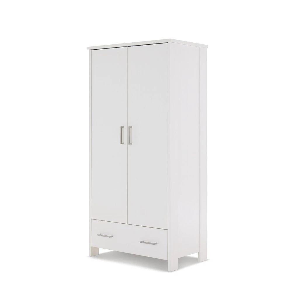 Completing the set is the Nika double wardrobe, featuring one large cupboard space, with two sturdy hanging rails for all of your little one’s special outfits, fronted by a pair of soft close doors. Underneath the main cupboard area is a single 33L capacity, full depth drawer providing the perfect storage solution for those items that cannot be hung up. Stylish brushed metal handles are used throughout the piece making sure it is simple to use.