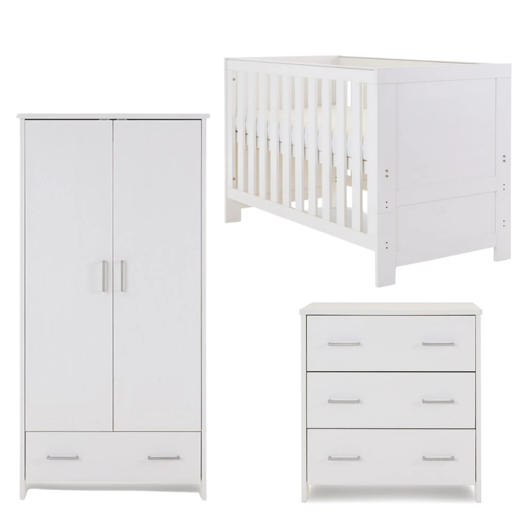 The Obaby Nika range offers a contemporary design, due to its clean lines and textured oak effect finish, that will fit perfectly in today’s modern nursery. This 3 piece room set consists of Nika cot bed, changing unit and double wardrobe.