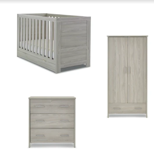 The Obaby Nika range offers a contemporary design, due to its clean lines and textured oak effect finish, that will fit perfectly in today’s modern nursery. This 3 piece room set consists of Nika Mini cot bed, changing unit and double wardrobe.