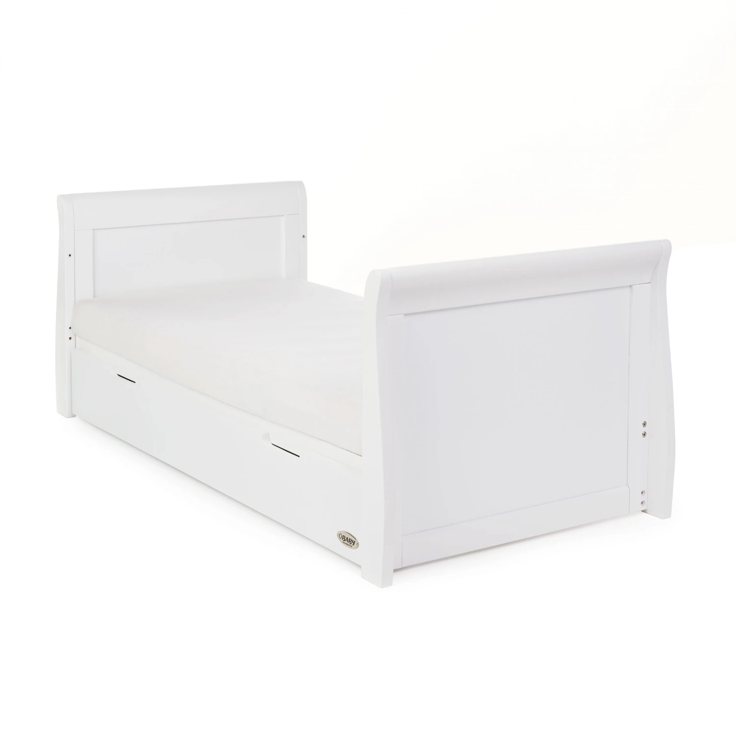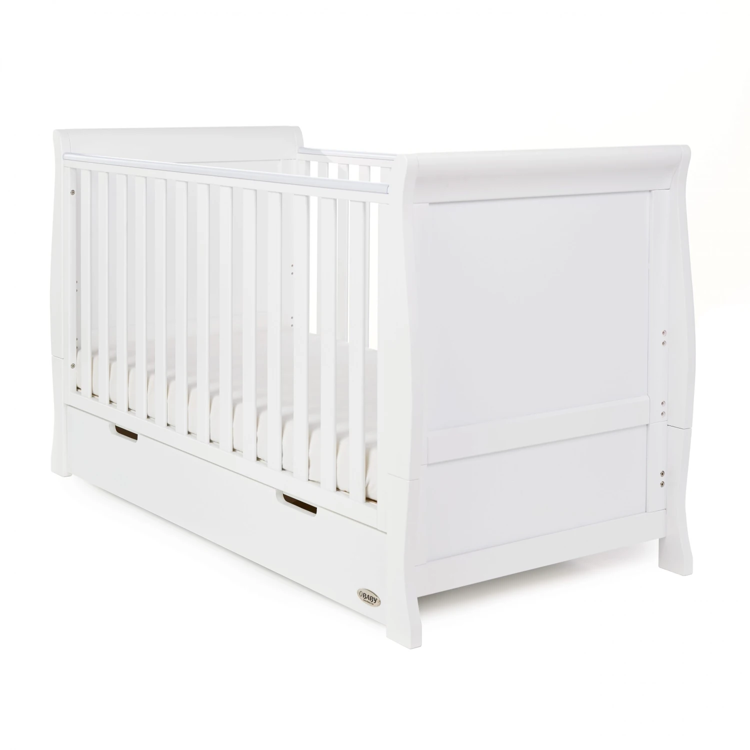 At the heart of the range is the beautiful Stamford Classic sleigh cot bed, with its elegant sleigh design offering traditional styling with a contemporary finish. Teething rails protect your child’s delicate teeth and the slatted sides ensure you can watch over your little one during their most peaceful times. The Stamford Classic offers an adjustable mattress base, the top position allowing you to put down your newborn without unnecessary bending and as your child grows, learning to sit and stand, the base can be lowered by two further positions to ensure your little one is safe and secure at all times. Once your child is old enough the Stamford Classic can be transformed into a stylish toddler bed to provide the perfect night’s sleep up until they are approximately four years old. Requires an Obaby 140 x 70cm mattress.
