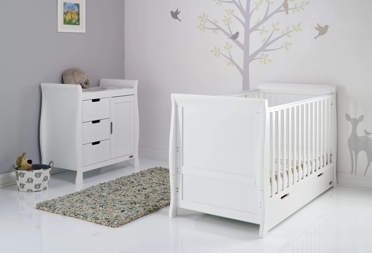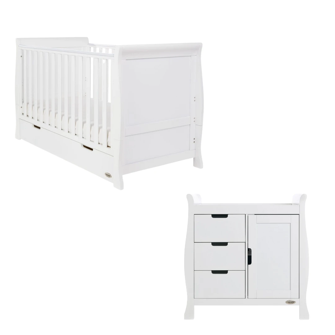 The Obaby Stamford furniture range offers families the perfect combination of style, quality and practicality. The Stamford Classic 2 piece room set consists of the beautiful Stamford Classic cot bed with under drawer and closed changing unit. Both pieces feature the same elegant sleigh design that flows throughout the Stamford range.