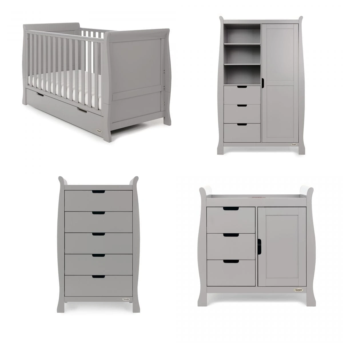 The Obaby Stamford furniture range offers families the perfect combination of style, quality and practicality. The Stamford Classic 4 piece room set consists of the beautiful Stamford Classic cot bed with under drawer, closed changing unit, double wardrobe and tall chest of drawers. All pieces feature the same elegant sleigh design that flows throughout the Stamford range.