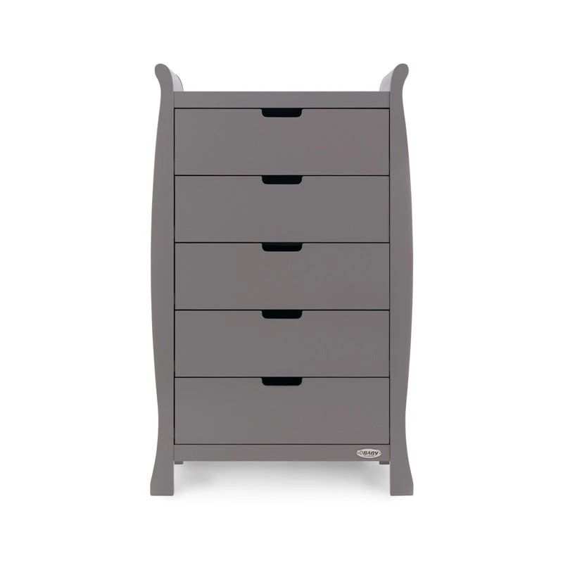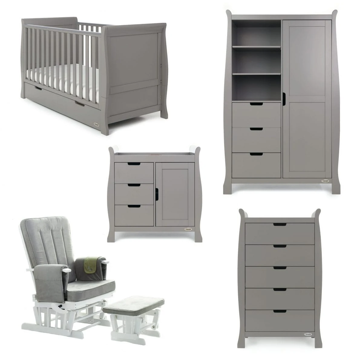 The Obaby Stamford furniture range offers families the perfect combination of style, quality and practicality. The Stamford Classic 5 piece room set consists of the beautiful Stamford Classic cot bed with under drawer, closed changing unit, double wardrobe, tall chest of drawers and deluxe reclining glider chair. All pieces feature the same elegant sleigh design that flows throughout the Stamford range.