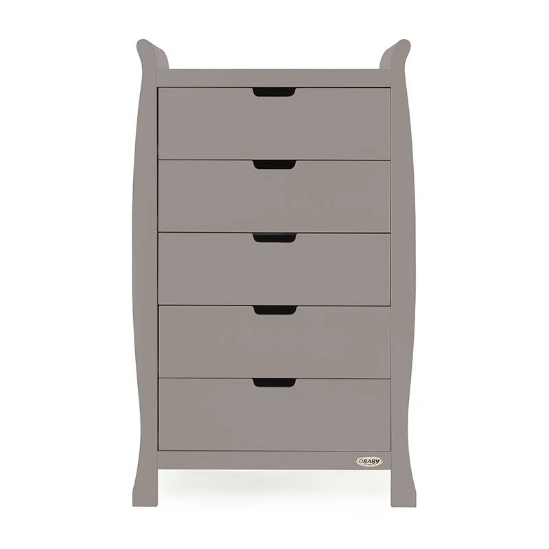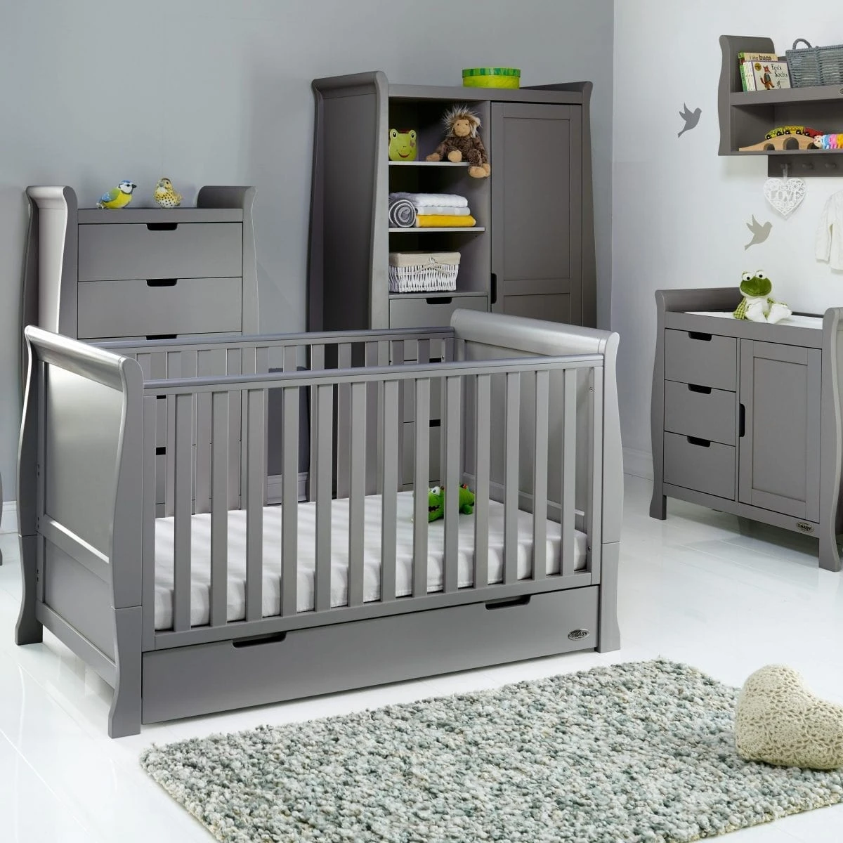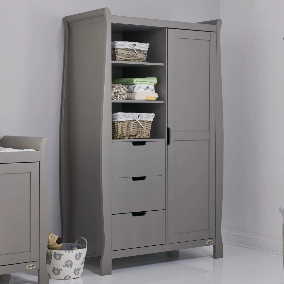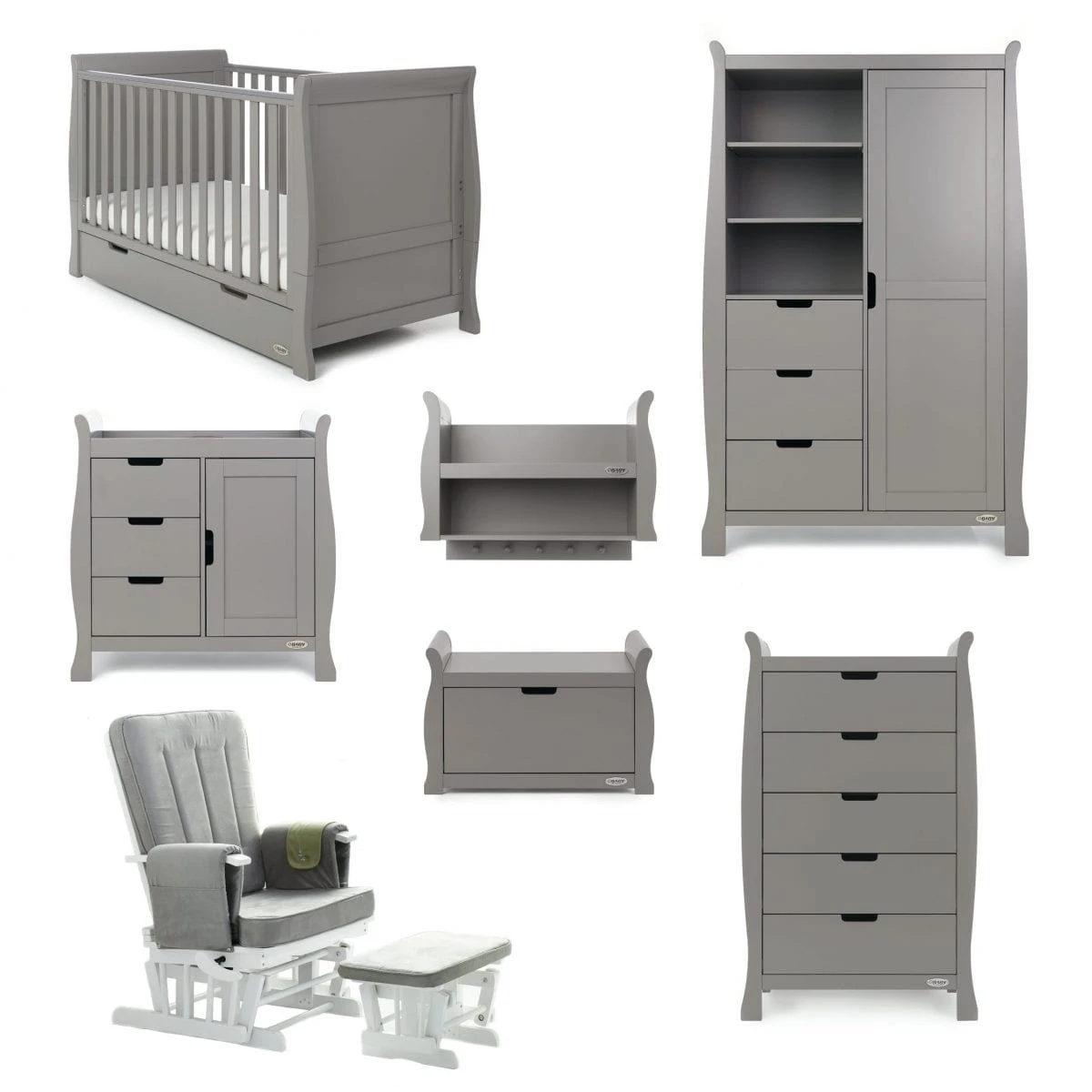 The Obaby Stamford furniture range offers families the perfect combination of style, quality and practicality. The Stamford Classic 7 piece room set consists of the beautiful Stamford Classic cot bed with under drawer, closed changing unit, double wardrobe, tall chest of drawers, toy box, shelf and deluxe reclining glider chair. All pieces feature the same elegant sleigh design that flows throughout the Stamford range.