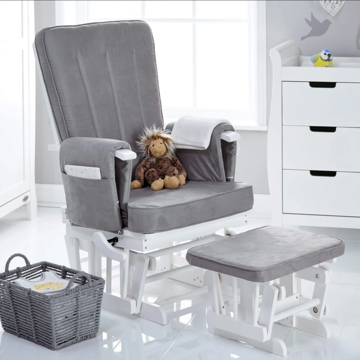 To complete the perfect nursery set, the deluxe reclining glider chair is the perfect place for you and your little one to share some precious time. No matter what the occasion, the gentle gliding motion of the chair soothes your little one to sleep whilst helping you unwind. By simply lifting the arm ends, the backrest angle can be effortlessly adjusted by an impressive seven positions so you can always find the right one for you. The extra thick, luxuriously padded back and seat cushions ensure you never want to leave and the padded arm rests each feature a handy storage pocket to keep any important items close to hand. When you are finished relaxing, a conveniently located gliding lock handle means you can make the chair static in any stage of its glide. The included gliding stool perfectly mimics the motions of the chair ensuring nothing gets in the way of your tranquil time.