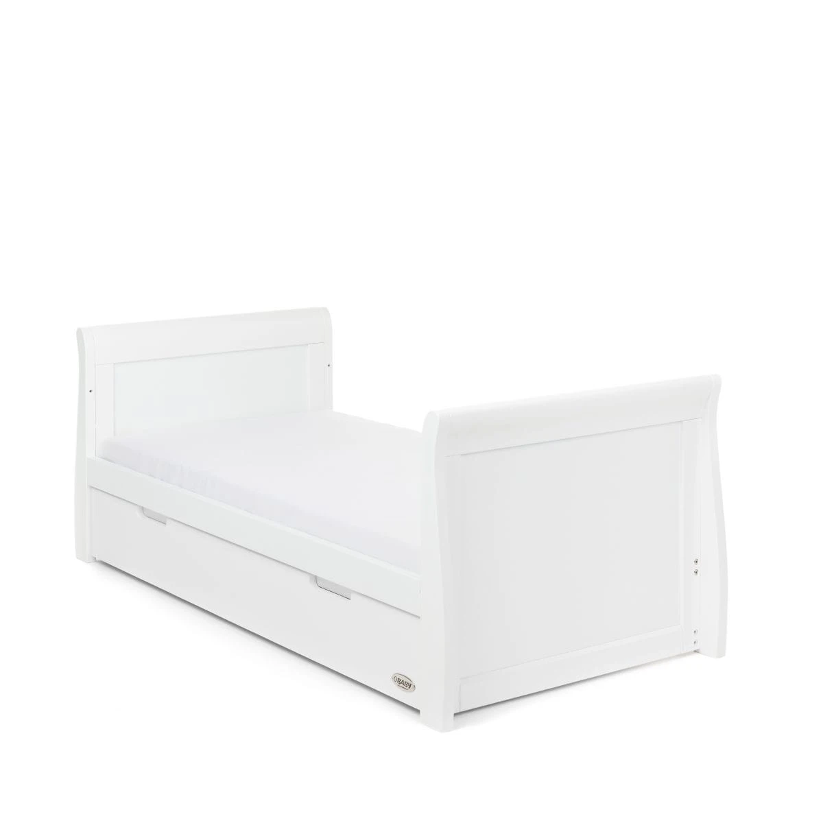 At the heart of the range is the beautiful Stamford Classic sleigh cot bed. Teething rails protect your child’s delicate teeth and the slatted sides ensure you can watch over your little one during their most peaceful times. The Stamford Classic offers an adjustable mattress base that can be lowered as your child grows to ensure your little one is safe and secure at all times. Once your child is old enough, the Stamford Classic can be transformed into a stylish toddler bed to provide the perfect night’s sleep up until they are approximately four years old. Requires an Obaby 140 x 70cm mattress. Also includes a generous 70L capacity underdrawer for extra storage space.