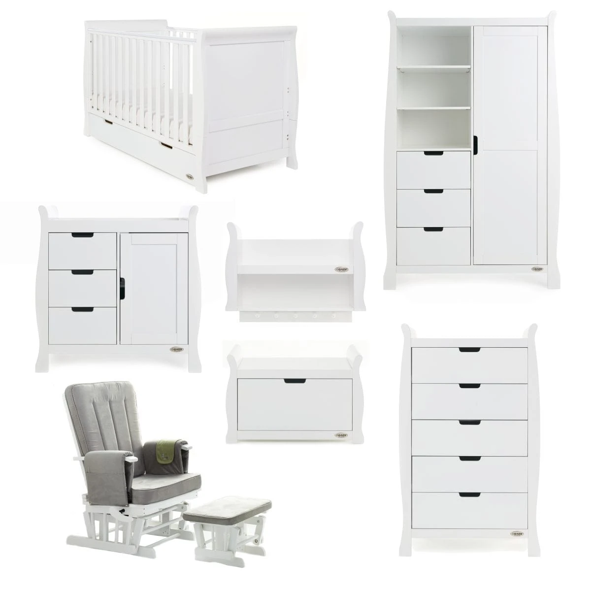 The Obaby Stamford furniture range offers families the perfect combination of style, quality and practicality. The Stamford Classic 7 piece room set consists of the beautiful Stamford Classic cot bed with under drawer, closed changing unit, double wardrobe, tall chest of drawers, toy box, shelf and deluxe reclining glider chair. All pieces feature the same elegant sleigh design that flows throughout the Stamford range.
