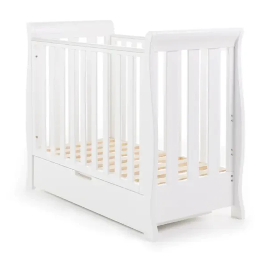 Needing less space than the Stamford Mini cot bed, the Space Saver cot features the same elegant sleigh design as the rest of the collection, teething rails to protect your little ones delicate first teeth and a three-position adjustable mattress base. The top position allows your newborn to be put down and taken out of the cot easily without unnecessary bending, then as your child grows, learning to sit and stand, the base can be lowered by a further two positions providing extra security and reassurance all the way up to approximately 18 months old. Requires an Obaby 100 x 50cm mattress (sold separate)