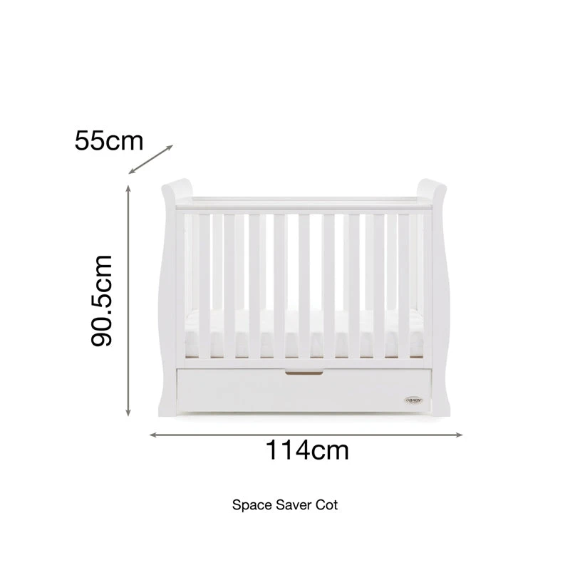 Needing less space than the Stamford Mini cot bed, the Space Saver cot features the same elegant sleigh design as the rest of the collection, teething rails to protect your little ones delicate first teeth and a three-position adjustable mattress base. The top position allows your newborn to be put down and taken out of the cot easily without unnecessary bending, then as your child grows, learning to sit and stand, the base can be lowered by a further two positions providing extra security and reassurance all the way up to approximately 18 months old. Requires an Obaby 100 x 50cm mattress.