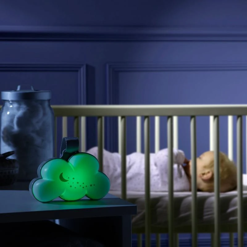 Calming battery powered multi-coloured night light with soothing sounds to help your baby fall asleep, featuring 10 lullabies, 4 nature and a heartbeat sound with volume control. The colour changing glow gently fades to dark after 30 minutes helping your baby drift off to sleep naturally. The Dream Cloud comes with a handy velcro loop to attach to cot bars.