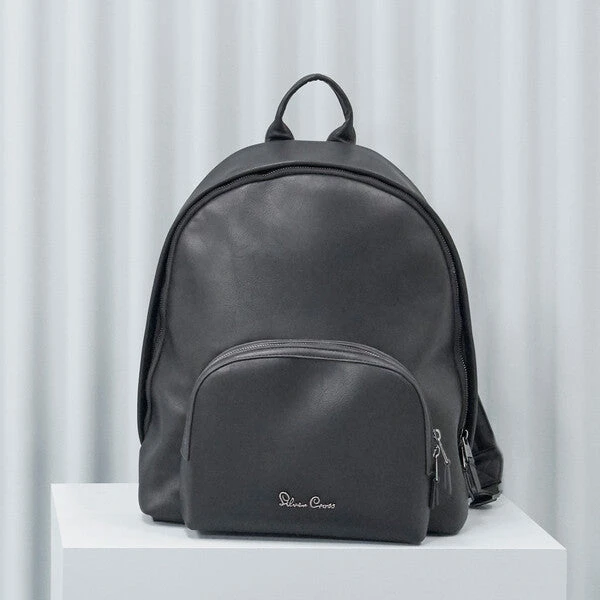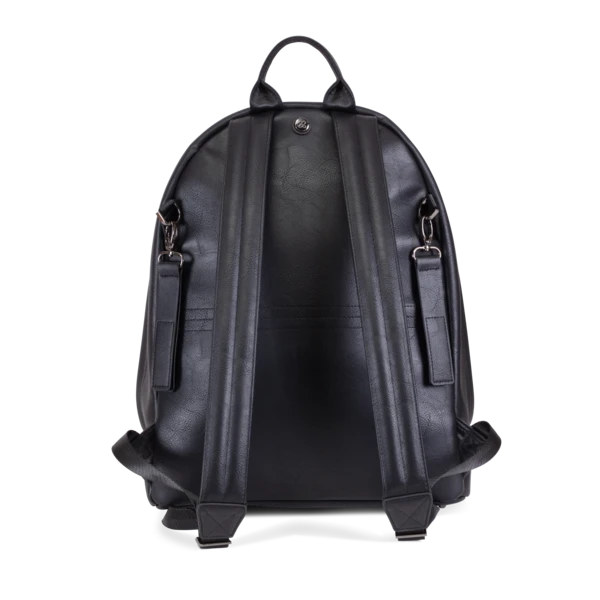 On-trend, black/brown or tan vegan leather rucksack with ample storage pockets, changing mat and corresponding bottle holder