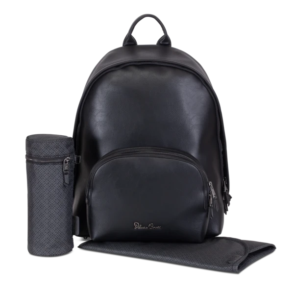 The Silver Cross Dune Ultimate Pack includes a vegan rucksack changing bag in Black, a matching footmuff, car seat adaptors, cupholder and snack tray.