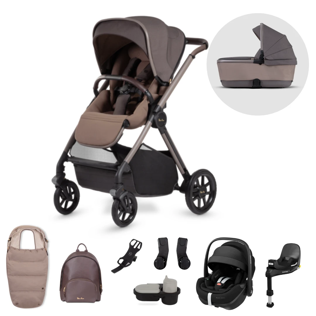 Say hello to the Silver Cross Reef Stroller, First Bed Folding Carrycot & Maxi-Cosi Pebble 360 Pro Ultimate Pack in Earth, the multi-terrain baby pushchair boasting impressive design and sleek sophistication.