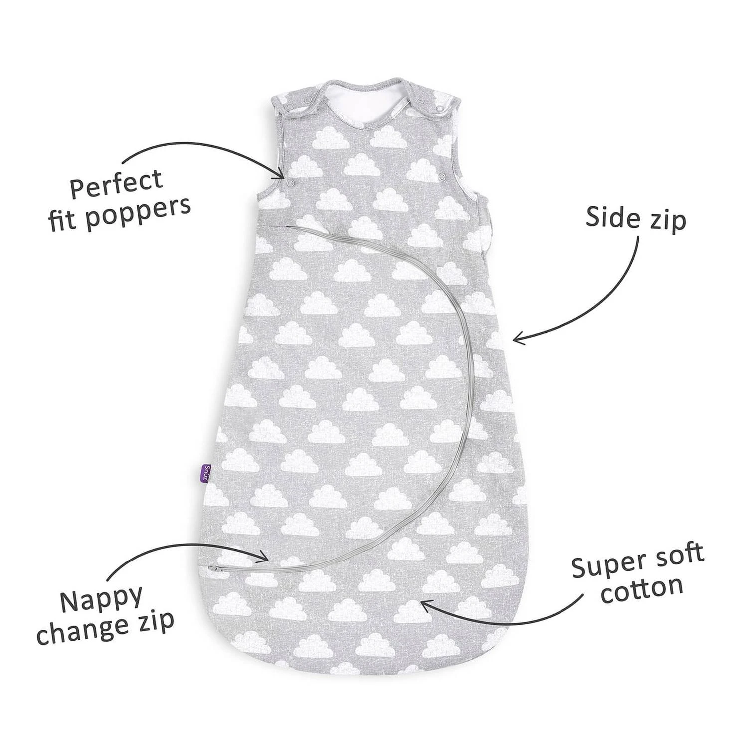 SnüzPouch Sleeping Bag 1.0 tog in Cloud 9 is a new collection of clever sleeping bags by Snüz®, with modern designs and unique features to help make sleep easy.Â